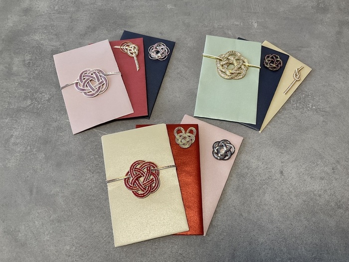 みつば工房では、水引の「あわじ結び」や「梅結び」など様々な形のものをポチ袋のアクセントなどに加工し、作成しております。
